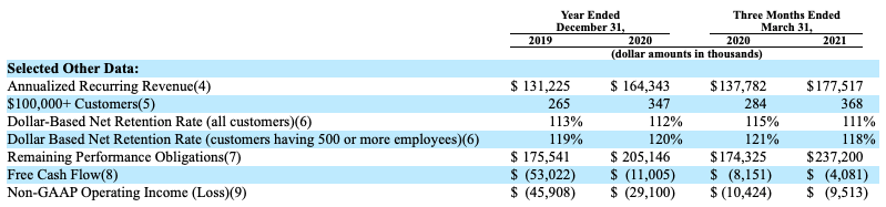 It isn’t great that we’re seeing the company’s aggregate DBNR fall from 2019 to 2020, and from Q1 2020 to Q1 2021. And its modest improvement of its larger-customer DBNR from 2019 to 2020 is undercut by its decline into the current year.