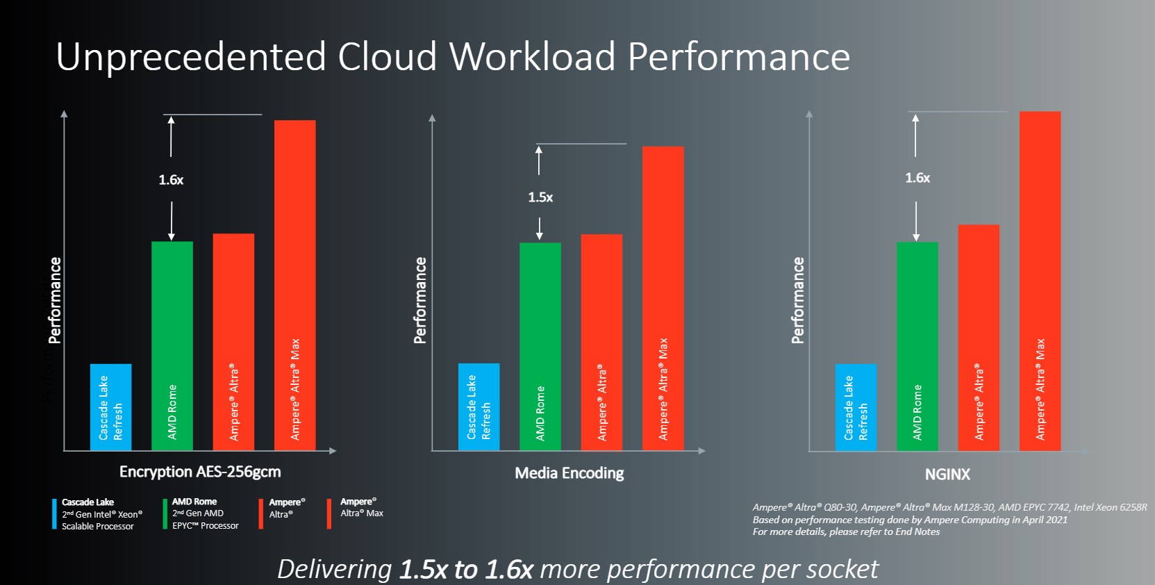 With the 128-core Altra Max, Ampere promises a chip that uses 50% less power per core compared to an AMD Rome CPU and performance gains of 1.6x for running the NGINX web server, for example. And all of those benchmarks look even better when compared to an Intel Cascade Lake Refresh CPU. AMD’s Rome launched in August 2019 and Intel’s Cascade Lake Scalable Performance Refresh CPU have been in the market since last February.