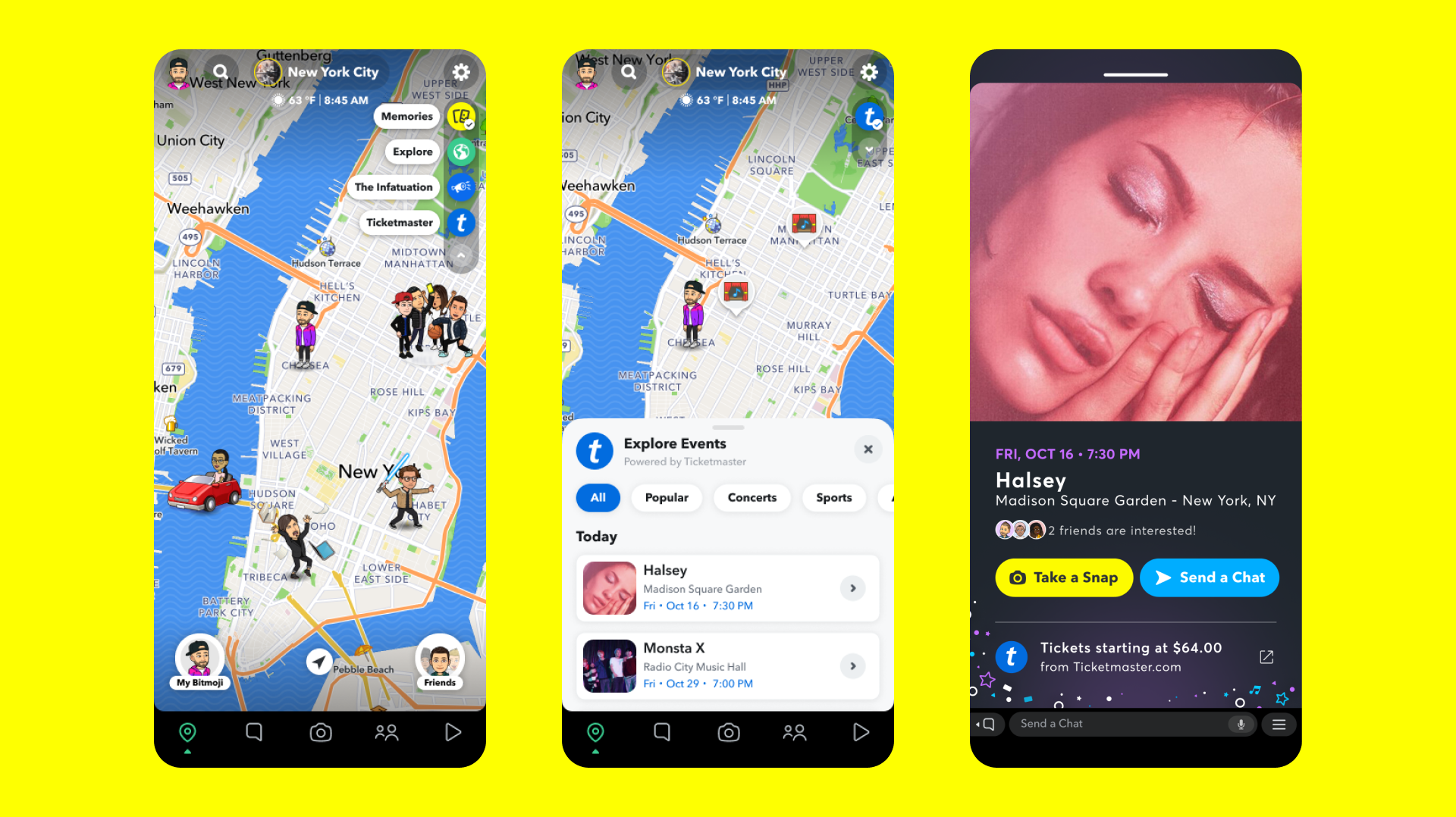 With the Ticketmaster Layer, users will be able to sort through shows at nearby concert venues and can get transferred from the Layer directly to a new Ticketmaster Mini to buy tickets inside the Snapchat app. With The Infatuation, users can scan the map for editorialized recommendations for nearby restaurants with lists and reviews from the site. More of these partnerships on the way, though it doesn’t sound like Snap is planning to open the floodgates to developers anytime soon.