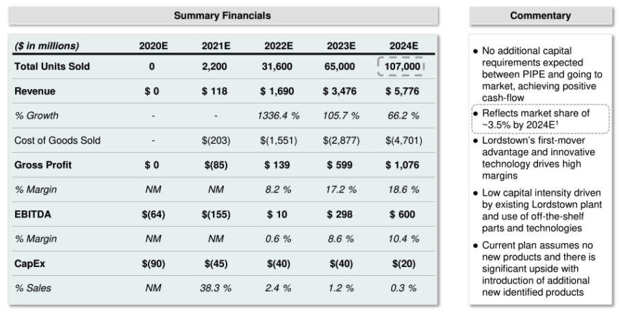 Lordstown expected to sell 2,200 vehicles, generate $118 million in revenue and book capex of $45 million. And as you read in the first bullet point in the right column, “no additional capital” was the pitch to investors; that means no future dilution or debt raises that would force the company into a less-stable financial picture.