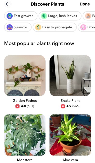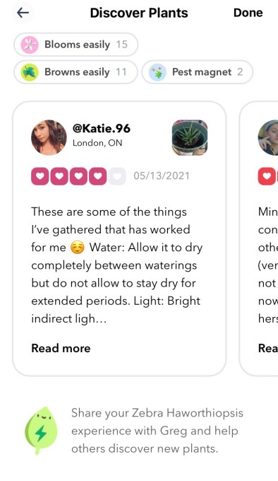 Primarily, Greg works by telling people when to water their plants — that’s not something you can just set a weekly reminder for, as every plant is a bit different. Greg’s recommendations are tailored to each plant’s species, geographic location, sun exposure and proximity to a window. This makes it easy for anyone to keep their greenery thriving in any circumstance. There’s also a discover feed built into the app, where users can share photos of their plants, which have names like “Keanu Leaves” and “Michelle Branch.”