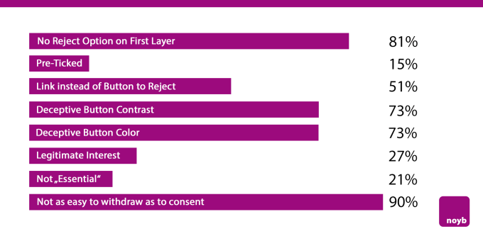 noyb’s assessment of this batch also found that a full 90% did not provide a way to easily withdraw consent as the law requires.