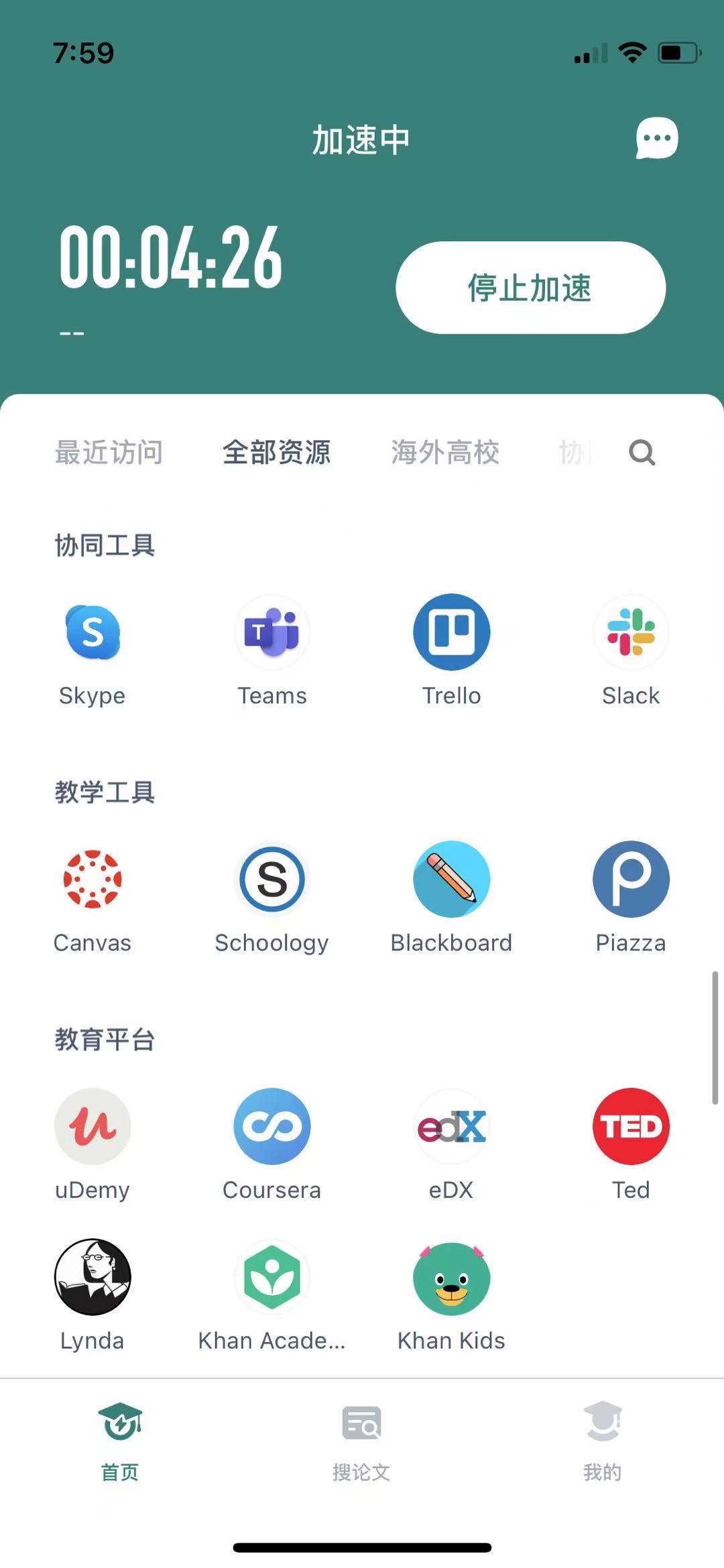 Once a country is picked, Chang’e shows a list of educational resources that users can visit on the app’s built-in browser. They include the websites of 79 top universities, mostly U.S. and the U.K. ones; team collaboration tools like Microsoft Teams, Trello and Slack; remote-learning platforms UDemy, Coursera, Lynda and Khan Academy; research networks such as SSRN and JSTOR; programming and engineering communities like Stack Overflow, Codeacademy and IEEE; economics databases from the World Bank and OECD; as well as resources for medical students like PubMed and Lancet.