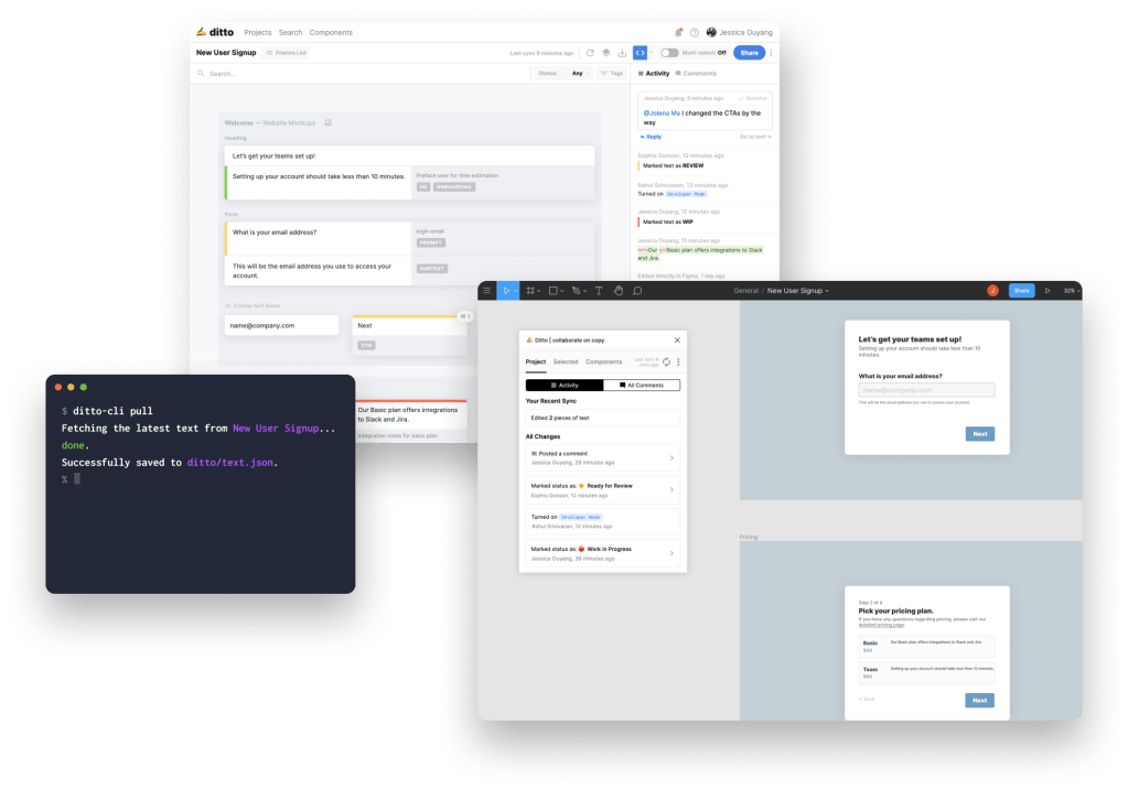 Out of the gate, Ditto has been built for Figma, meaning users can easily export text blocks from designs in the app and rework them inside the Ditto web app, pushing updates without having to dig through the designs themselves. The founders say they are currently working on building out integrations for Sketch and Adobe XD as well. Inside the Ditto web app users can access change logs and update the status of particular pieces of text inside a project so that approvals are always certain.