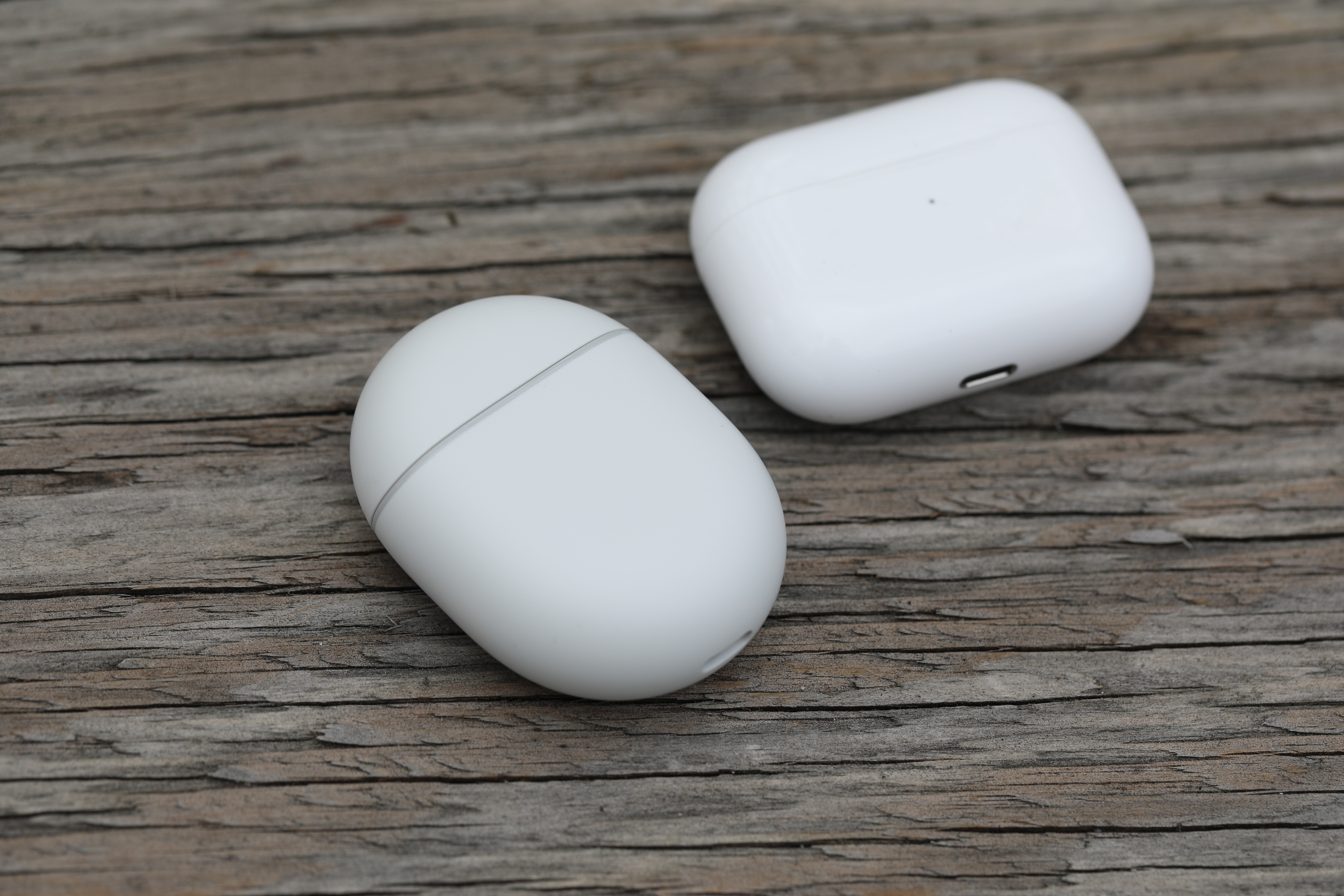 The case is the same vertically oriented oval design as the earlier version. It’s similar in volume to the AirPods Pro — so pretty easy to just pop into a pocket. The USB-C charging port is on the bottom; a light up front tips you off on charging status and the sync button is toward the bottom of the back. Flip up the top and reveal two familiar earbuds.