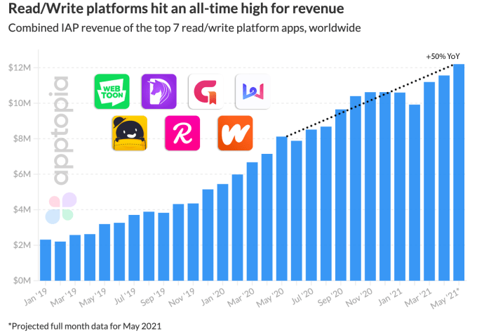 The top reading and writing apps grew their IAP revenue 50% YoY in May 2021, Apptopia reported. This group includes apps for writing novels or comic books, or reading the works from others, like Webtoon, Wattpad, Dreame, GoodNovel, Webnovel, Tapas and Radish. As a grouping, these apps have also grown IAP revenue 15% over the past six months. Since January 2020, Webtoon and Dreame combined accounted for 56.3% of the grouping’s total IAP revenue.