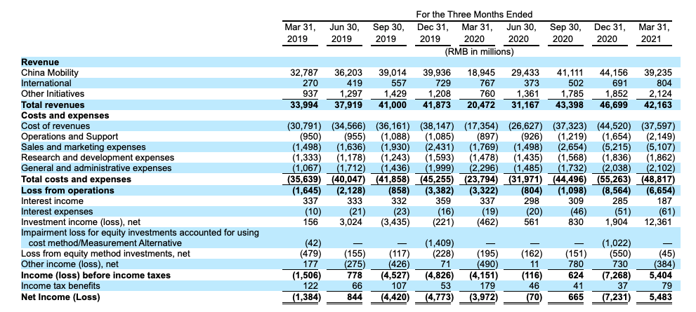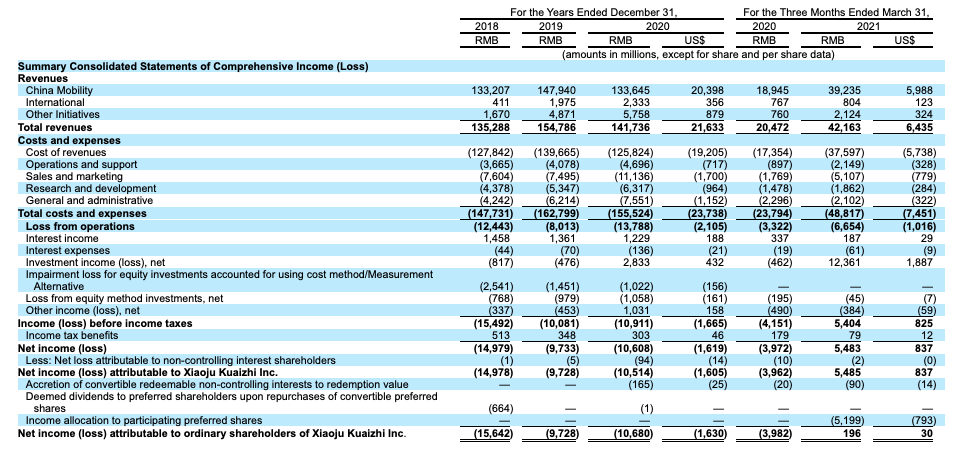 Focusing on more recent results — looking at the three columns on the right — shows that the company’s revenue more than doubled from Q1 2020 to Q1 2021, resulting in $6.4 billion in total top line, $7.5 billion in total costs and an operating loss of $1 billion. That final figure was offset by $1.9 billion worth of investment income, helping the company record GAAP net income of $837 million before we take into account some complex accounting regarding preferred shares.