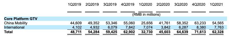 On a whole-company basis, Didi’s “core platform GTV,” or the “sum of GTV for our China Mobility and International segments,” posted numbers that are less impressive in growth terms: