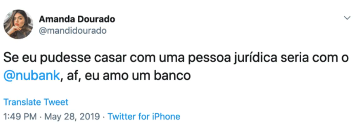 The tweet translates to: “If I could marry a company, I’d marry @nubank, ugh, I love a bank.”