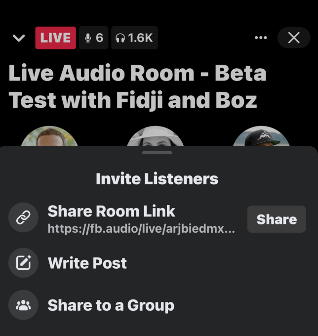 Listeners can “Like” or otherwise react to the content as it streams live using the “Thumbs Up” button at the bottom of the screen. And they can choose to share the Audio Room either in a Facebook post, in a Group, with a friend directly or through other apps.