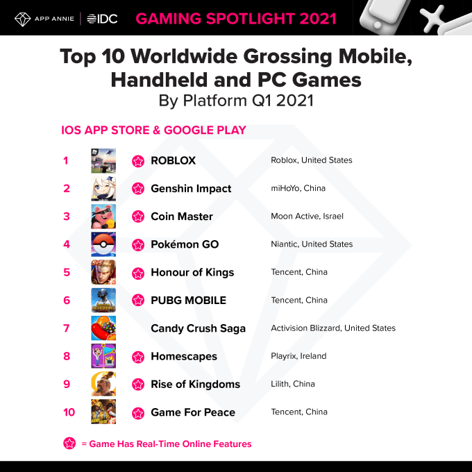 Games with real-time online features tend to dominate the Top Grossing charts on the app stores, including things like player-vs-player and cross-play features. For example, the top grossing mobile game worldwide on iOS and Google Play in Q1 2021 was Roblox. This was followed by Genshin Impact, which just won an Apple Design Award during the Worldwide Developer Conference for its visual experience.