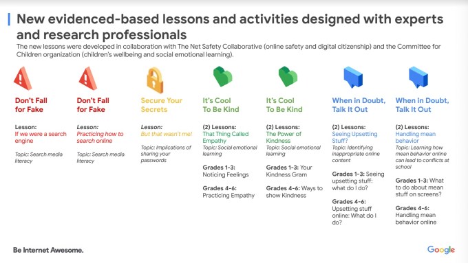 Google announced today it’s updating and expanding its digital safety and citizenship curriculum called Be Internet Awesome, which is aimed at helping school-aged children learn to navigate the internet responsibly. First introduced four years ago, the curriculum now reaches 30 countries and millions of kids, says Google. In the update rolling out today, Google has added nearly a dozen more lessons for parents and educators that tackle areas like online gaming, search engines, video consumption, online empathy, cyberbullying and more.