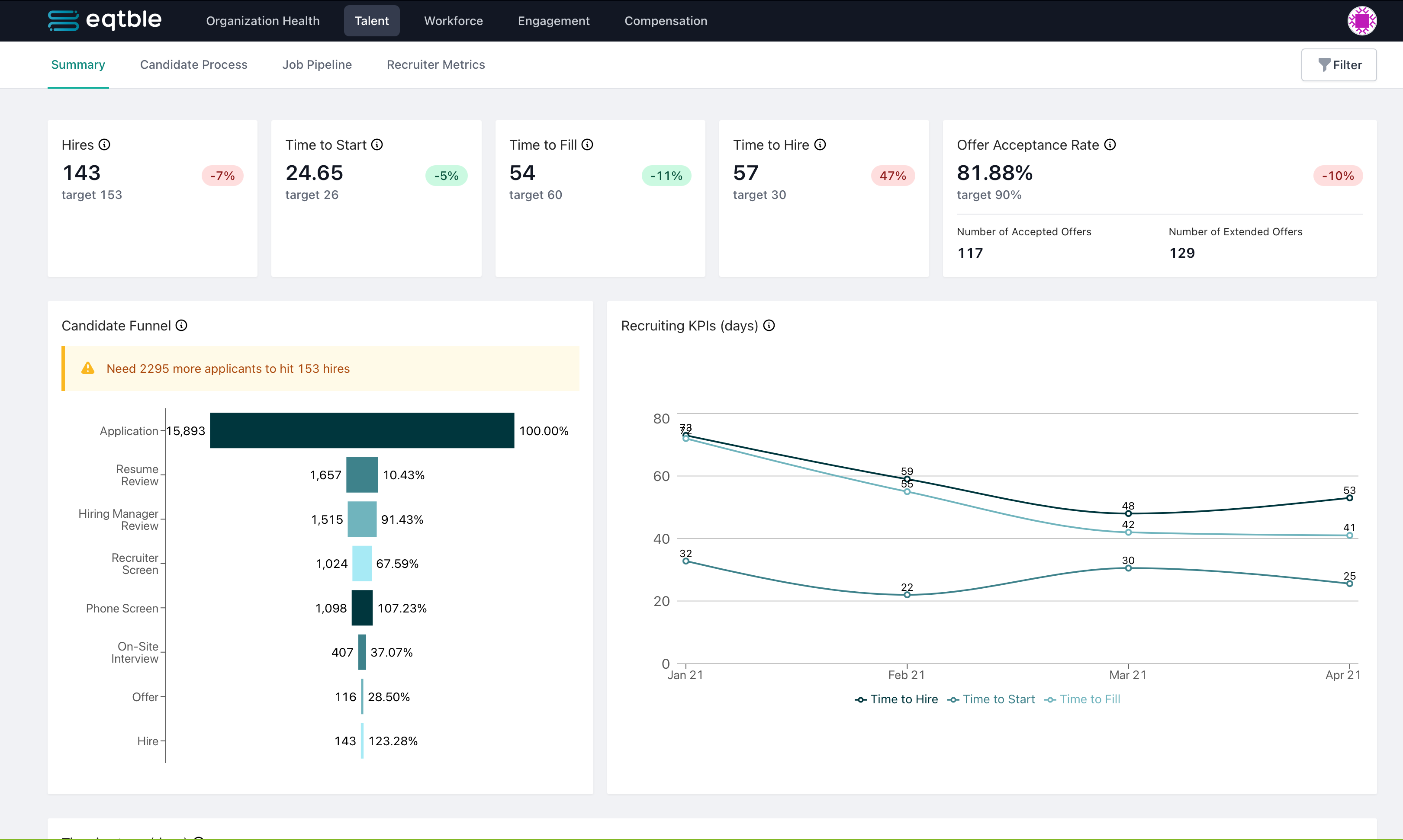 For example, one of eqtble’s clients realized that their hiring managers were being passed more applications than they had time to look at. This created a bottleneck, because they weren’t able to interview people quickly enough. Other clients saw that candidates were dropping out because the interview process was too long.