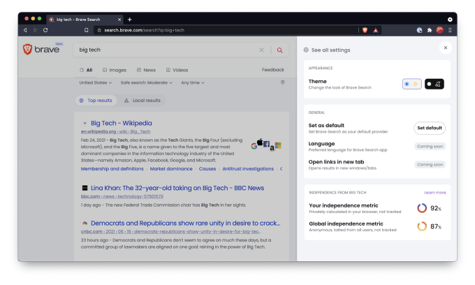 Users interested in checking out Brave’s nontracking search engine, which is built on top of an independent index and touted as a privacy-safe alternative to surveillance tech products like Google search, will find it via Brave’s desktop and mobile browsers. It can also be reached from other browsers via search.brave.com — so doesn’t require switching to Brave’s browser to use.