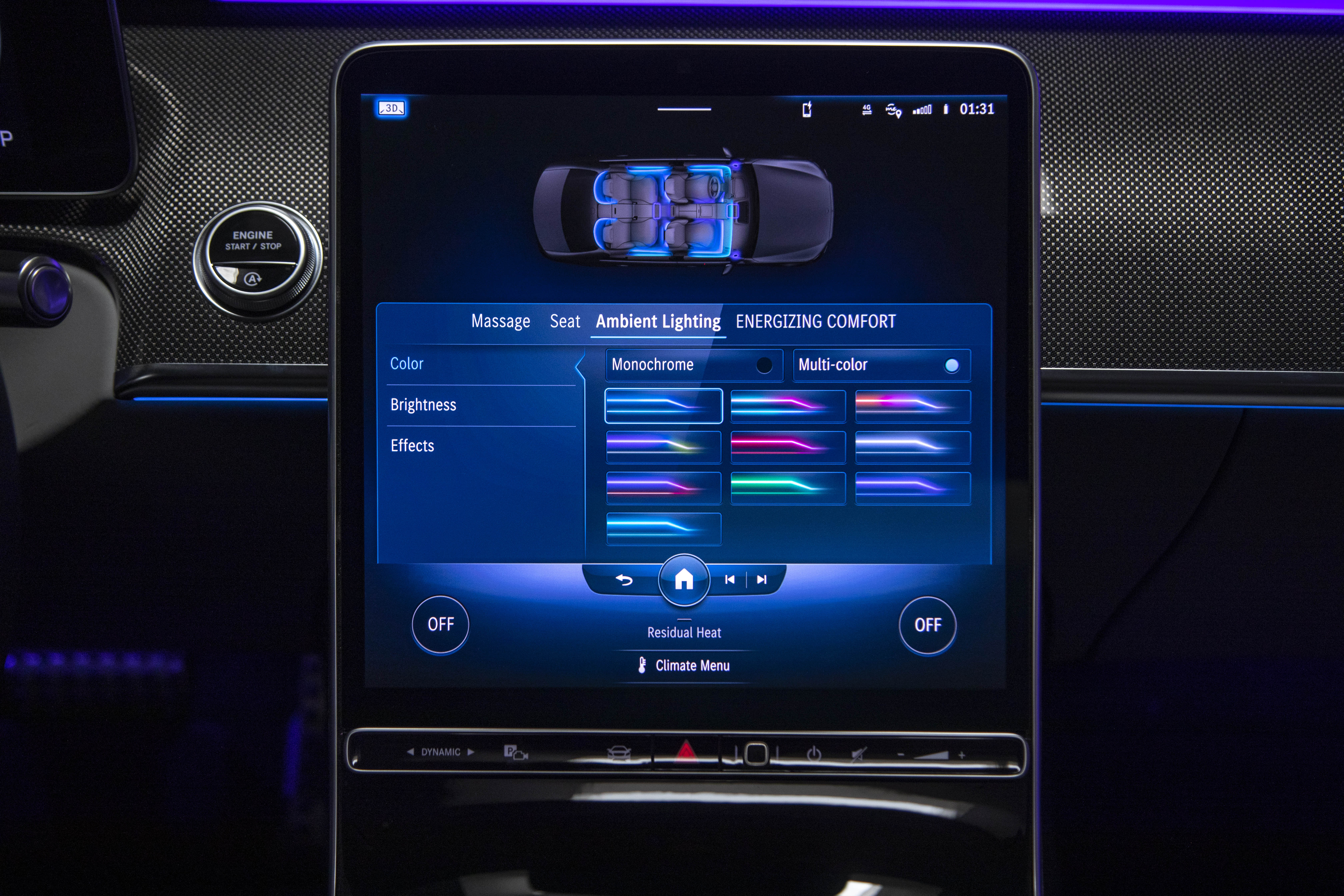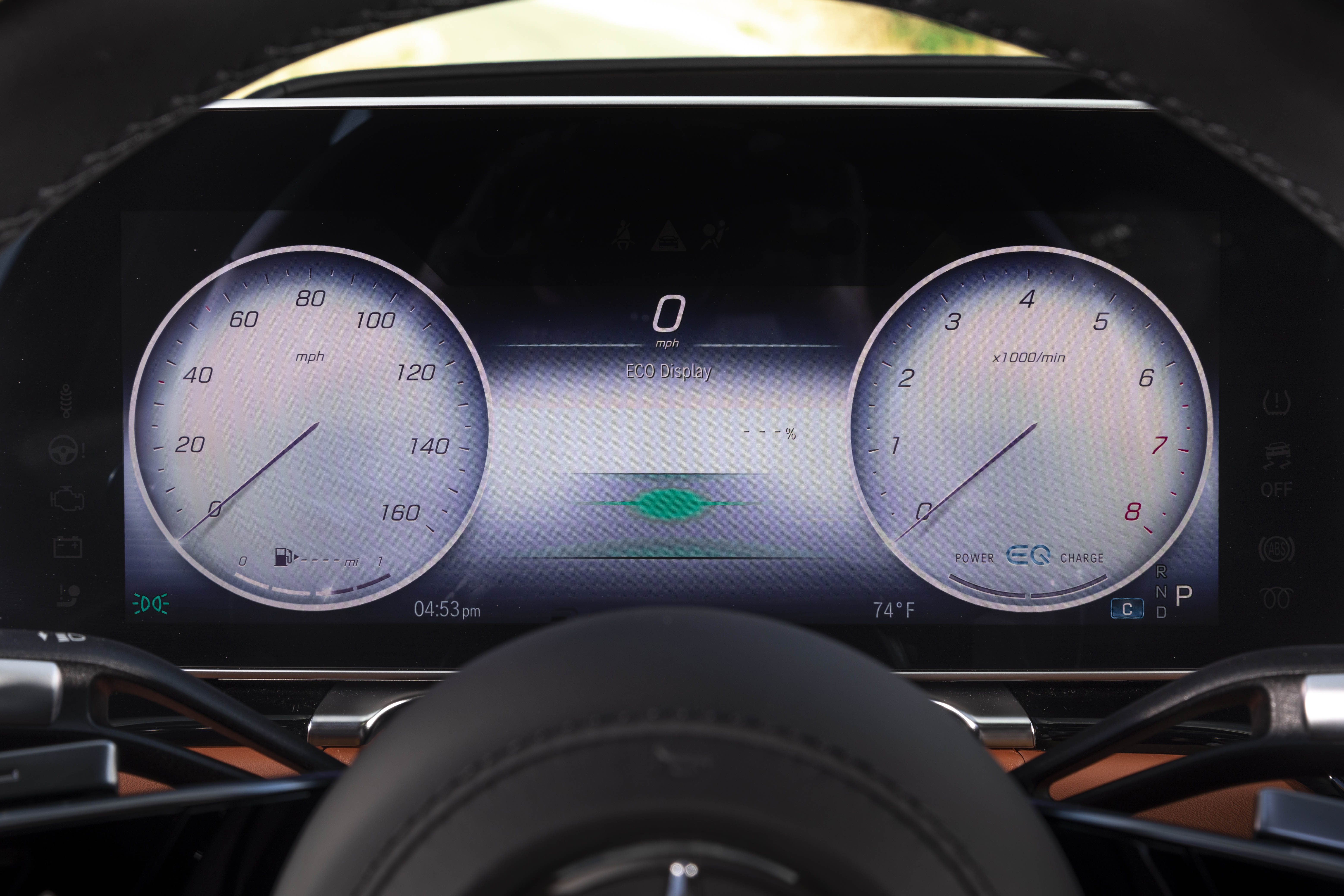 Unlike the EQS that my counterpart, Tamara Warren, drove, there was no 56-inch Hyperscreen in the $148,000-plus S580 I drove. Instead, a single 12.8-inch OLED screen that stretches from dash to armrest graces the center stack and is the control hub of the vehicle. Here you can do everything from control the fragrance that emanates from a diffuser in the glovebox to access Mercedes wellness features. The screen is bright and clear in high-noon sun with no glare and surprisingly not distracting at night.