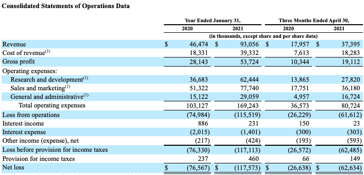 Anyhoo, what we can see here is roughly 100% growth from its year ending January 31, 2020, to the next. Even more, we can see that the company grew 108% from its most recent quarter (the period ending April 30, 2021) compared to the year-ago period. That’s speedy, and it indicates that the company’s growth is not in immediate danger of rapid deceleration.