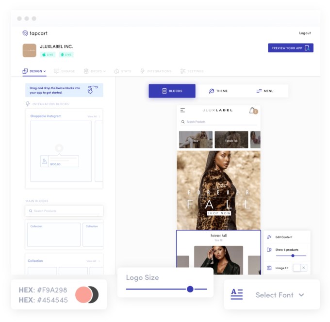 Tapcart’s platform itself offers a simple drag-and-drop builder that allows anyone to create a mobile app for their existing Shopify store using tools to design their layout, customize the product detail pages, integrate checkout options, include product reviews, and even optionally add other branded content, like blogs, lookbooks, videos (including live video) and more. Everything is synced directly from Shopify to the app in real-time, so the merchant’s inventory, products and collections are all kept up-to-date. That’s a big differentiator from some rivals, which require duplicate sets of data and data transformation.