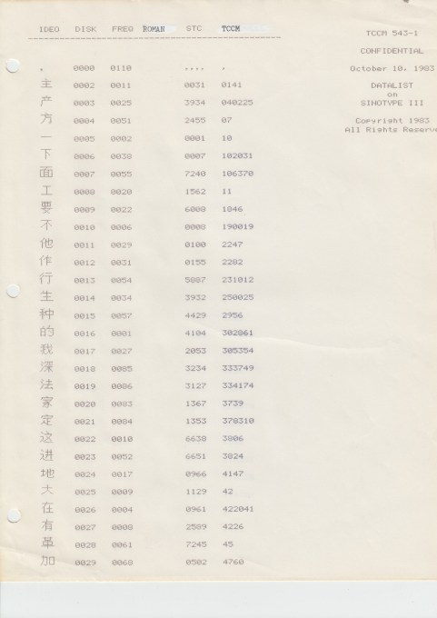 In order to mitigate this problem, Louis Rosenblum hit upon an idea that he referred to as “adaptive temporary storage.” Sinotype III would be able to adjust the set of characters stored in RAM depending upon what the user had recently inputted. Upon initial boot, Sinotype III’s on-board RAM would be outfitted only with a predetermined set of high-frequency characters. The inputting of any hard-drive-based infrequent character would take up to one second, as noted above. However, “as each of the less frequent ideographs is keyboarded,” he explained in a letter at the time, “its code and dot matrix pattern will be noted in the random access memory.” In other words, such characters would be temporarily copied from the hard drive to on-board RAM cache, thereby reducing subsequent retrieval times.