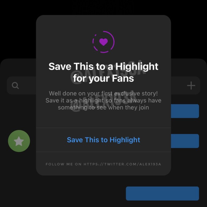 The screenshots, however, convey a lot about Instagram’s thinking, as they show a way that creators could publish what are being called “Exclusive Stories” to their accounts, which are designated with a different color (currently purple). When other Instagram users come across the Exclusive Stories, they’ll be shown a message that says that “only members” can view this content. The Stories cannot be screenshot, either, it appears, and they can be shared as Highlights. A new prompt encourages creators to “save this to a Highlight for your Fans,” explaining that, by doing so, “fans always have something to see when they join.”