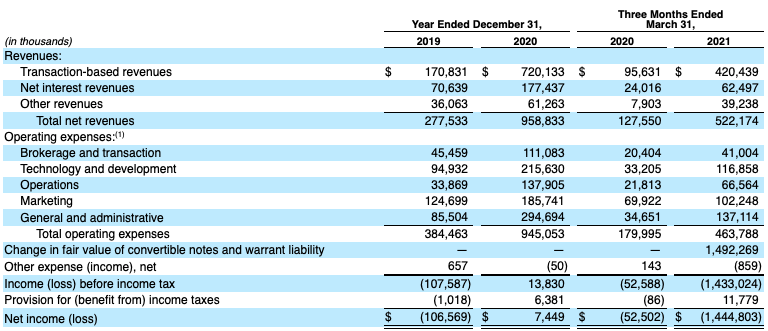 Now let’s talk profitability. Here’s Robinhood’s main income statement, which we’ll both need to discuss the company’s red and black ink: