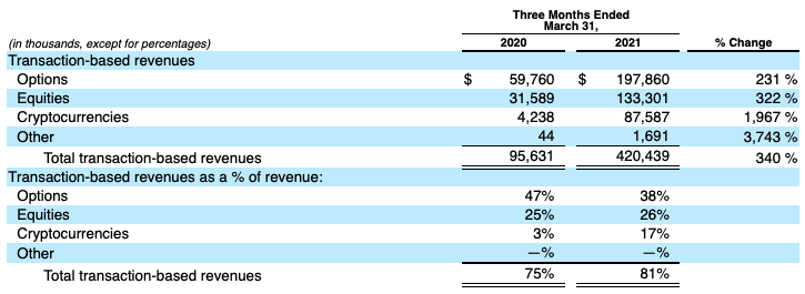 We can quickly see that Robinhood’s options incomes still reigned supreme in contribution terms during the first quarter of 2021, albeit at a loss of some luster to equities-generated top line. Why? GameStop, we reckon, and other stocks that likely helped Robinhood post record results in the period for the line item.
