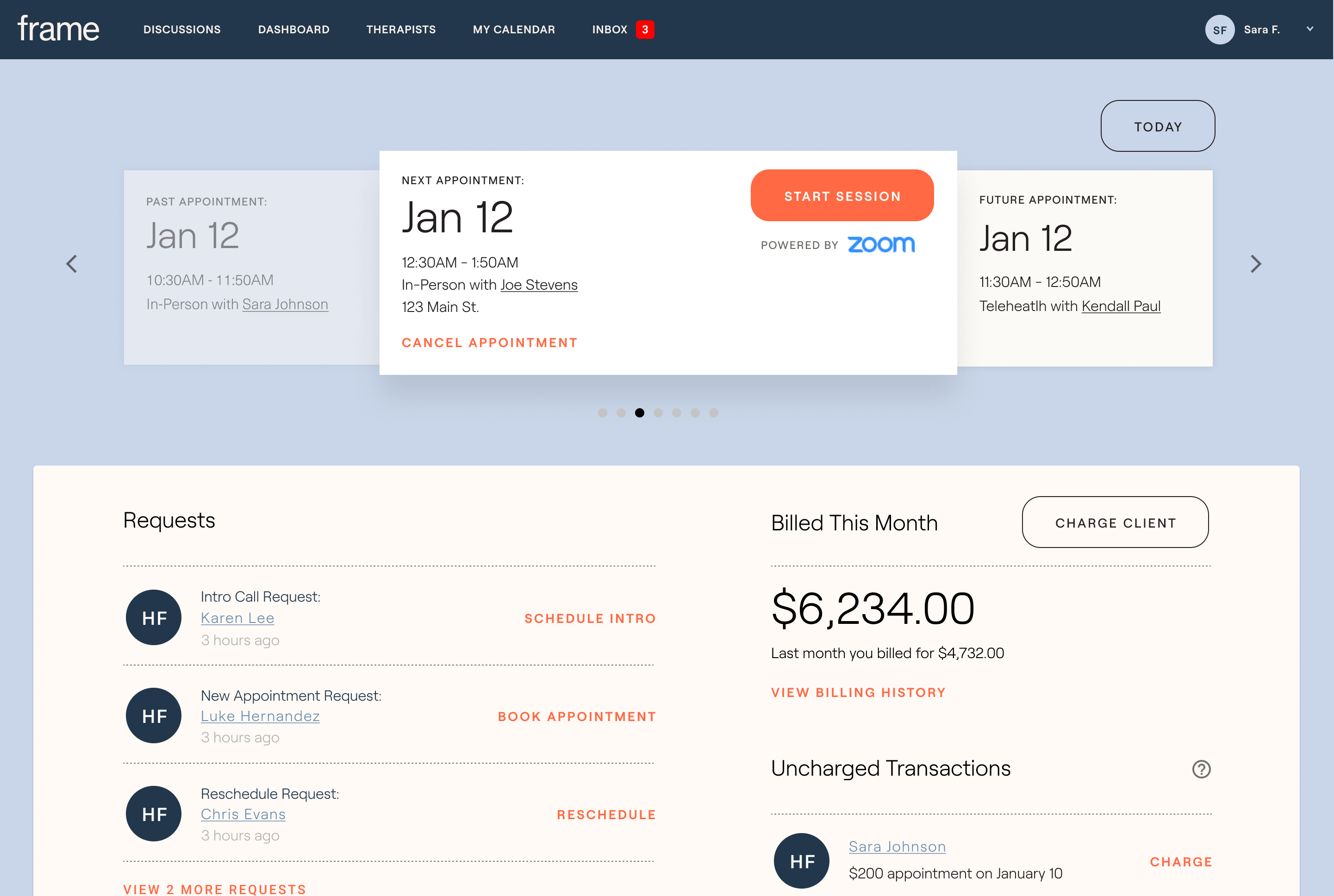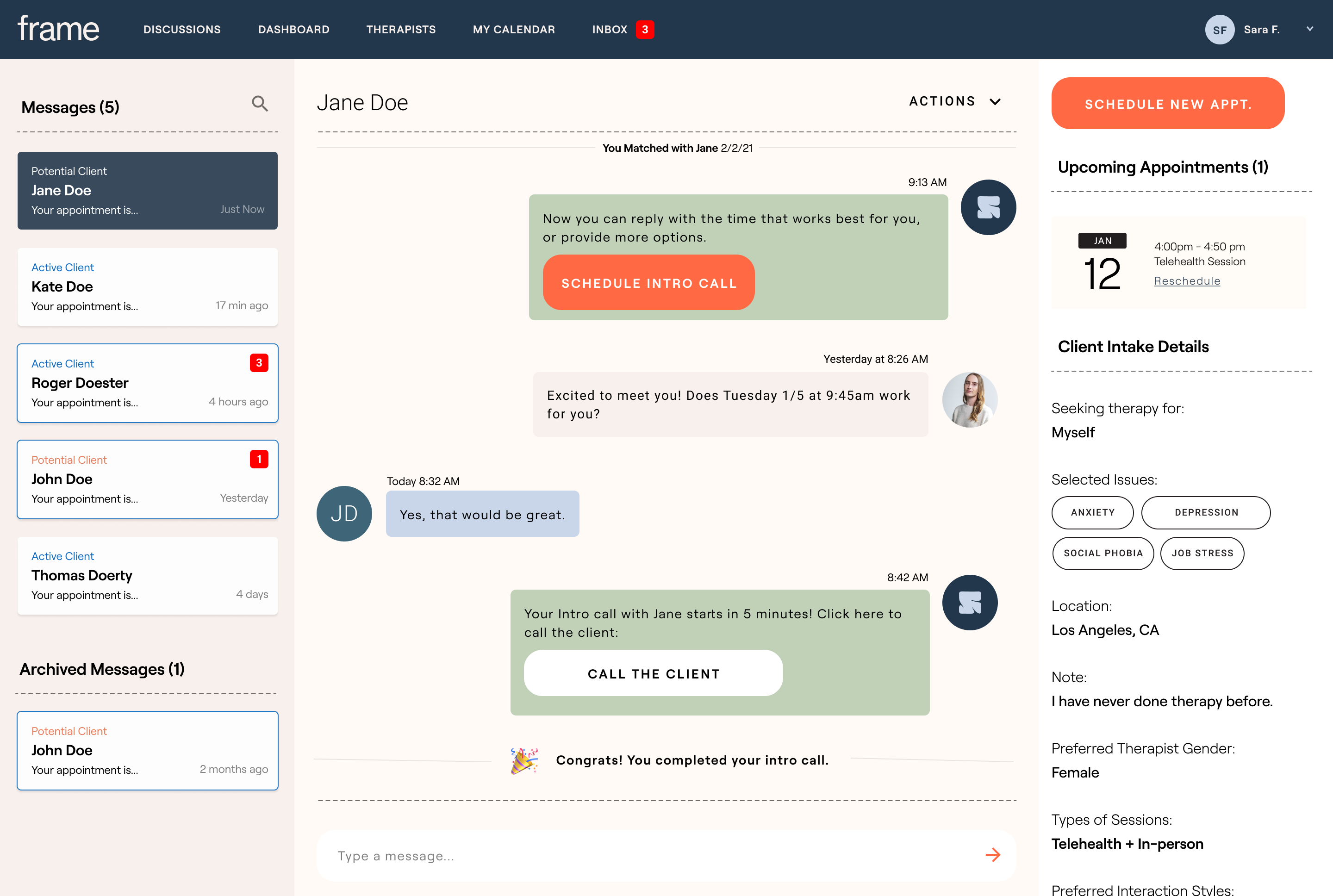 On the therapist’s side, Frame is meant to be a one-stop shop. Marketing and telehealth sessions are on there, as noted above, but so are things like scheduling, notes, billing, notifications, and so on, all tailored specifically to the needs of the industry. And while the shift to online services has been a long time coming, the company just happened to drop in just as the need went into overdrive.