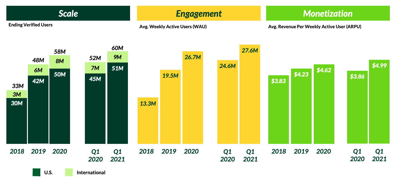 That means that the company has been most successful at boosting ARPU, second-best at adding verified users and least effective at adding engaged users over the past year.