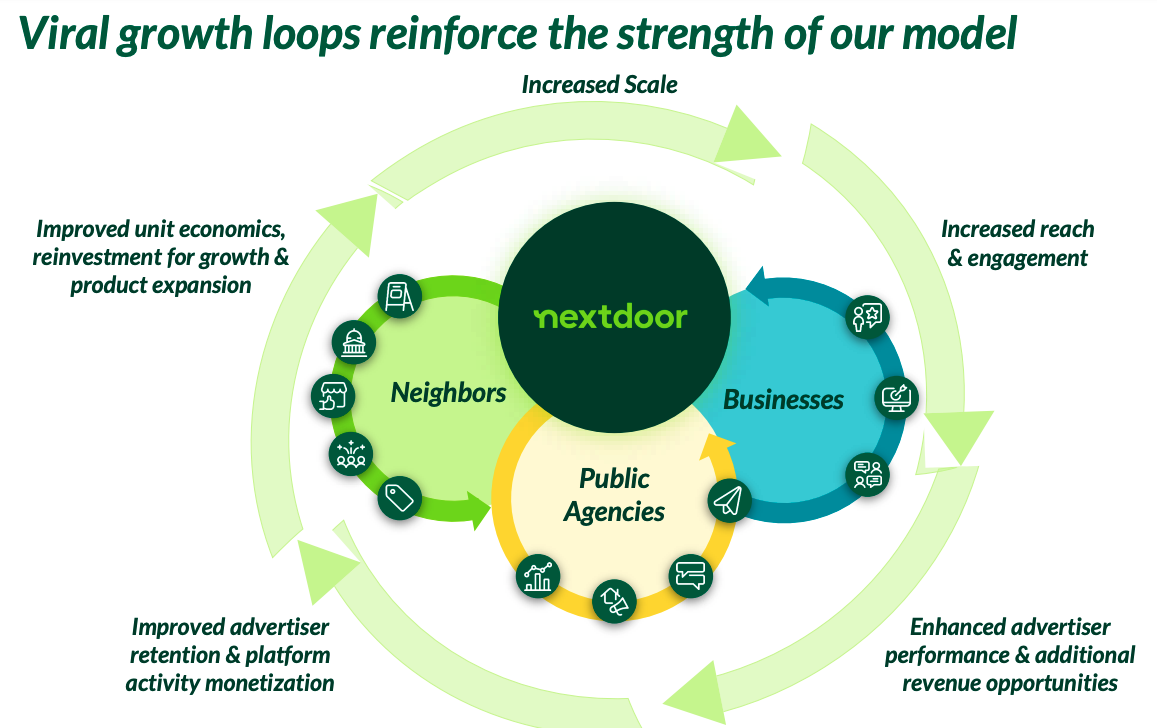 Regardless, the gist here is that — starting at the upper right — as the company adds users, it can provide a better monetization experience (lower right), which in turn will help Nextdoor better hold onto revenue partners (lower left), which will help it make more money to allow for greater investment and “product expansion” (upper left). And that product work leads the company to have more reach and more engagement, starting the wheel turning yet again.