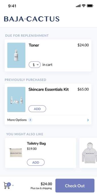 This replenishment cart is a special shopping cart that’s personalized to the individual customer and pre-filled with the product or products they’re due to repurchase, as well as other suggestions. But unlike a typical checkout experience, the customer can adjust the merchandise the cart contains — for example, by opting for a different flavor or scent for their product, or opting for a larger size, among other things.