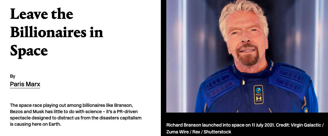 You can easily find reasons to dislike all three. Or you may just not like billionaires in general — I find this particular complaint reductive, but am stiffly in favor of a more progressive tax code and changes to how capital gains are taxed. But about the larger issue of “Why are we cheering on billionaires trying to beat one another to space when there are issues on the ground?”