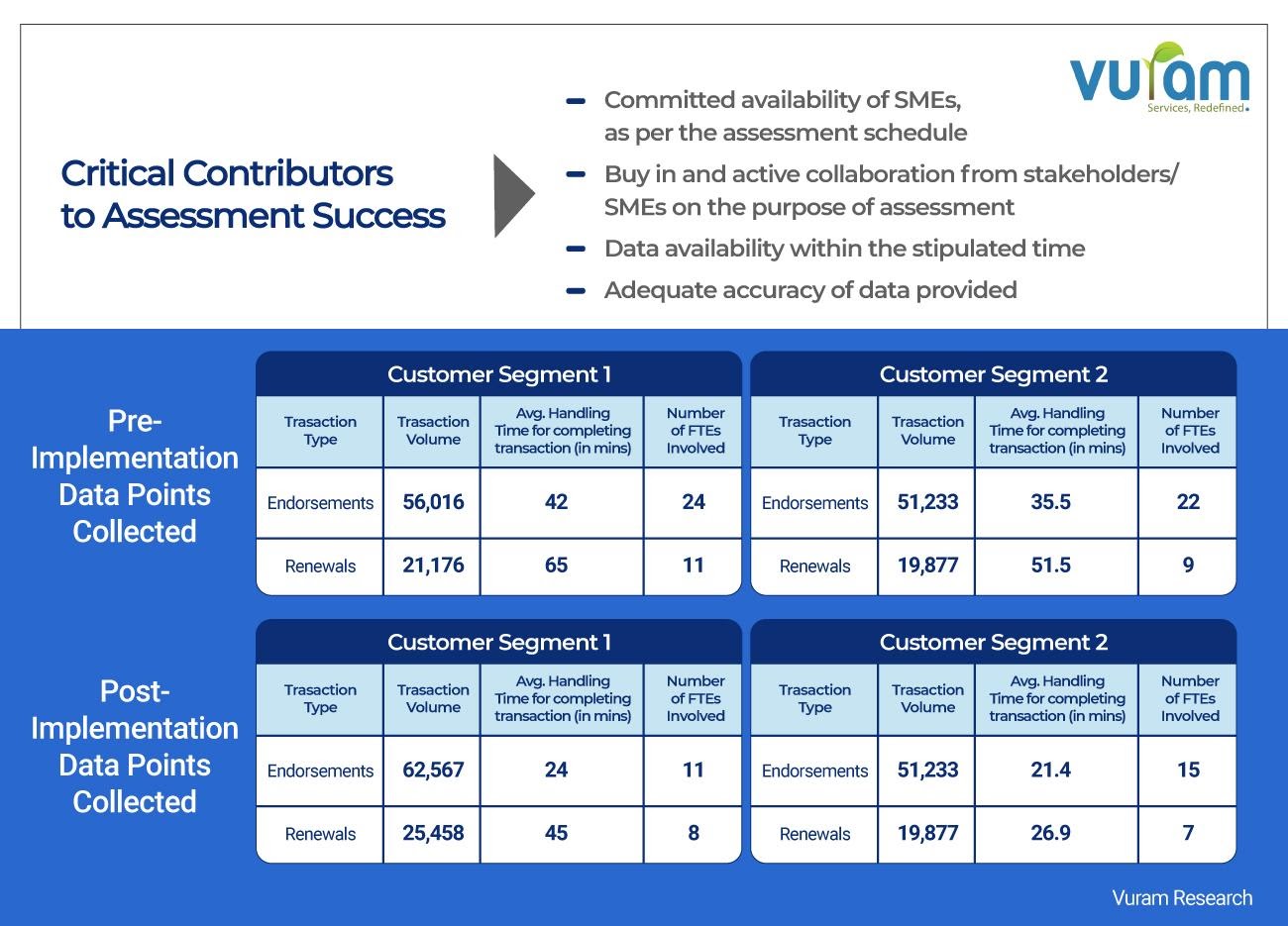 You can see a typical example below on pre- and post-implementation data points for an insurance client on their endorsements and renewals business.