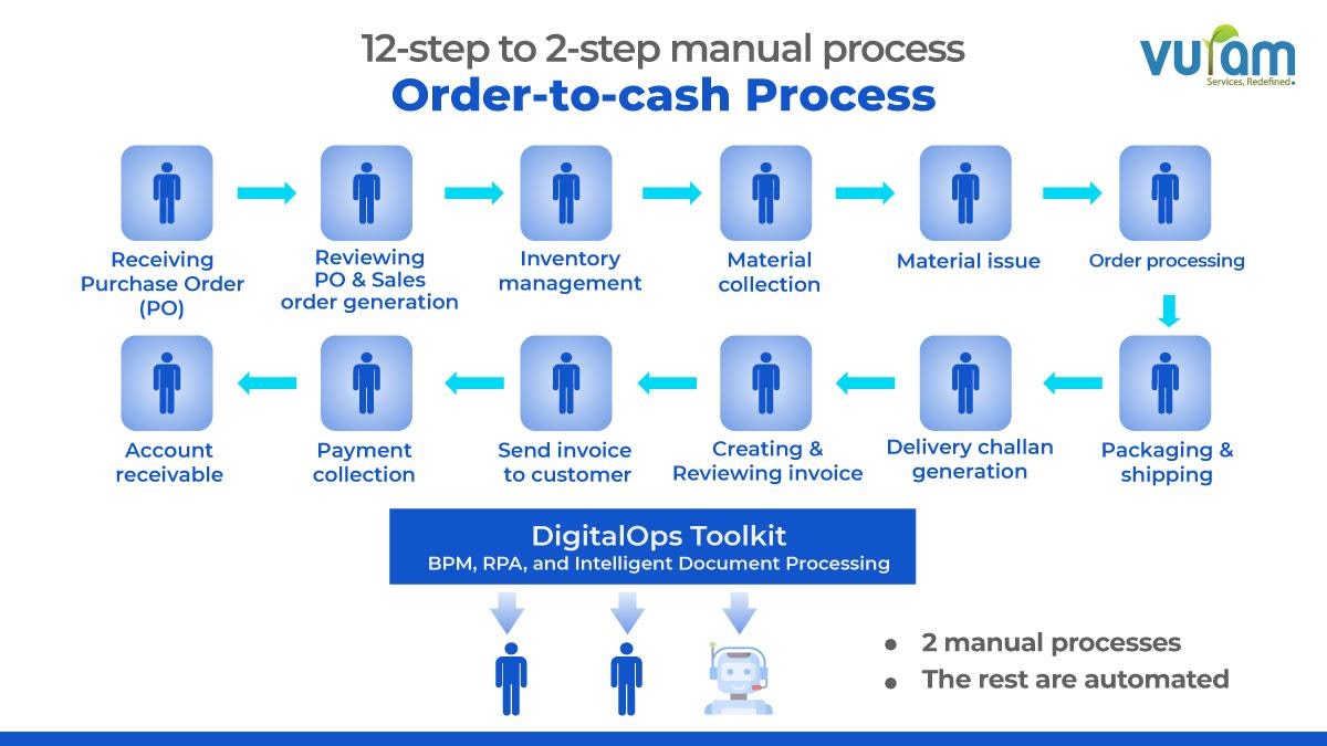 The traditional process involves intense collaboration among different teams including sales, inventory, order fulfillment and finance. With simple robotic process automation, we are looking at emails for invoices or bots performing repetitive tasks that humans do, say, inventory management and payment collection. Neither the teams nor the technologies talk to each other.