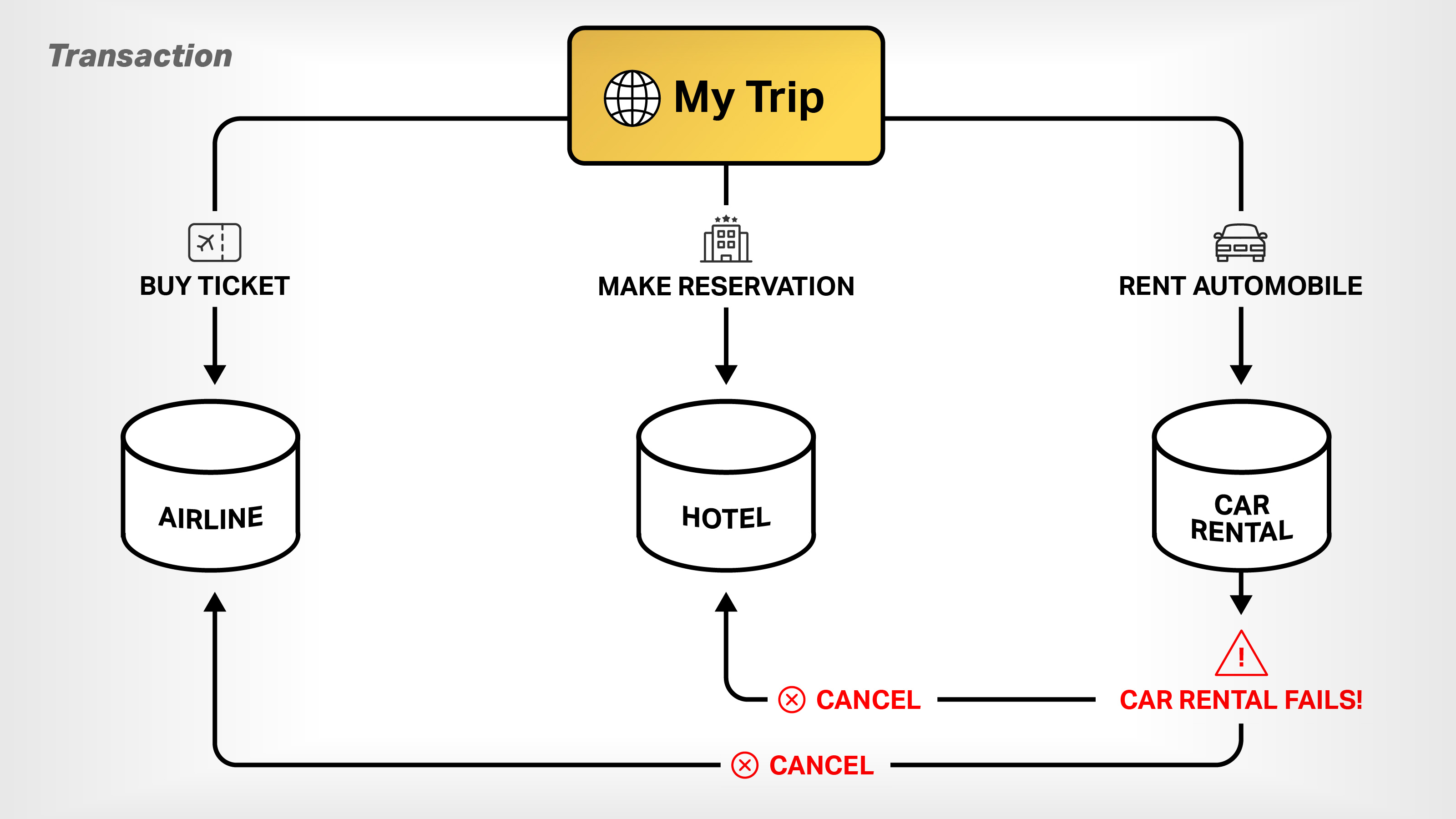 Transactions are essential when modifying data. The usual example of a transaction is making a travel reservation that involves buying an airplane ticket, reserving a hotel room and renting a car. Typically in enterprise data architectures, the data for flights, hotels and cars live separately. Thus, in order for a travel reservation to be successful, all three pieces of data need to be stored properly and updated synchronously.