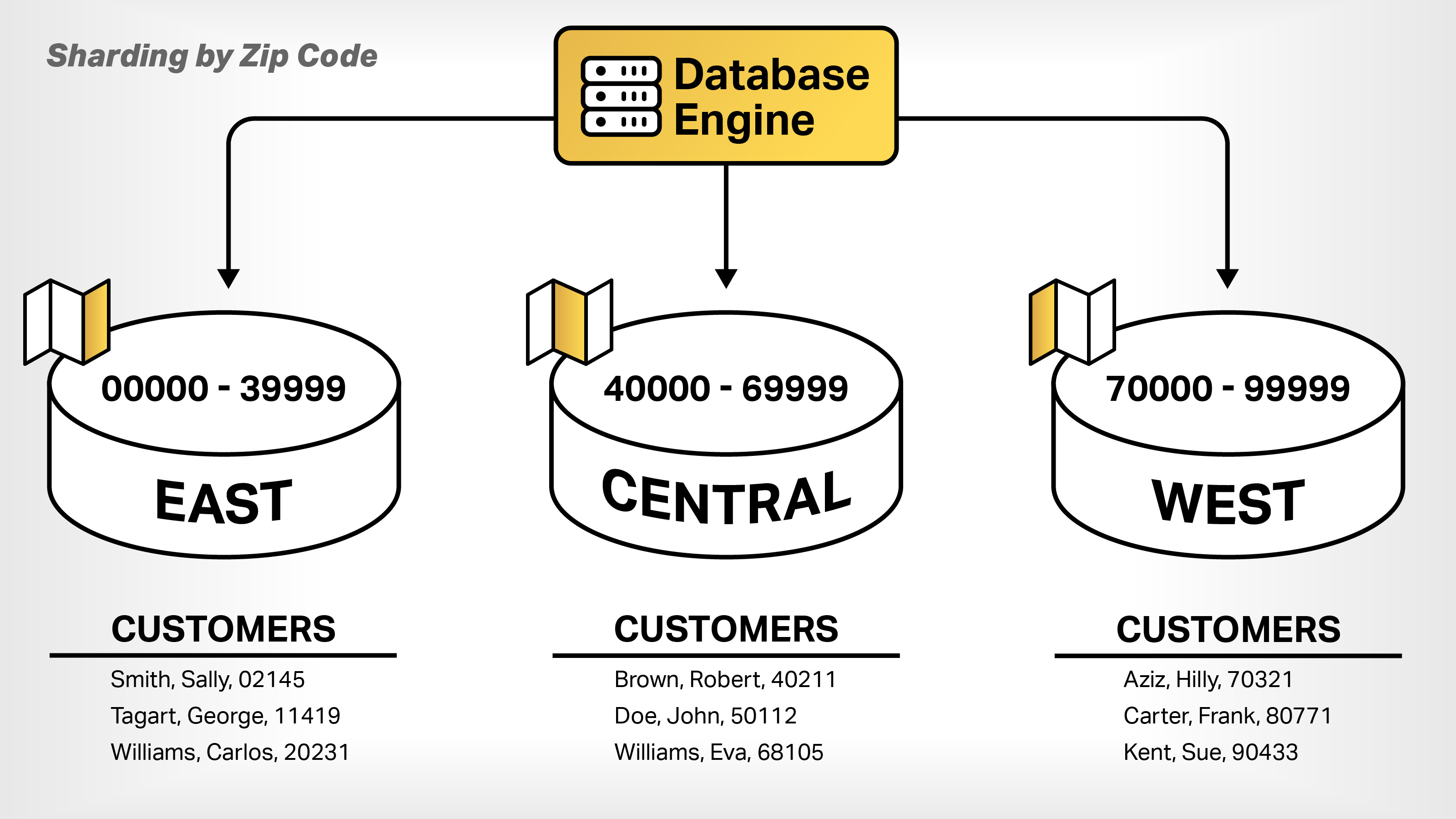 The benefit of sharding is that it makes retrieving data easy. Whenever a user executes a query against data in a database, the database engine scours the database to retrieve and assemble the data according to criteria of the query. For example, “give me all the users who live in a range of zip codes between 50000 and 50009” would be directed to the database server that hosts that particular range of zip codes.