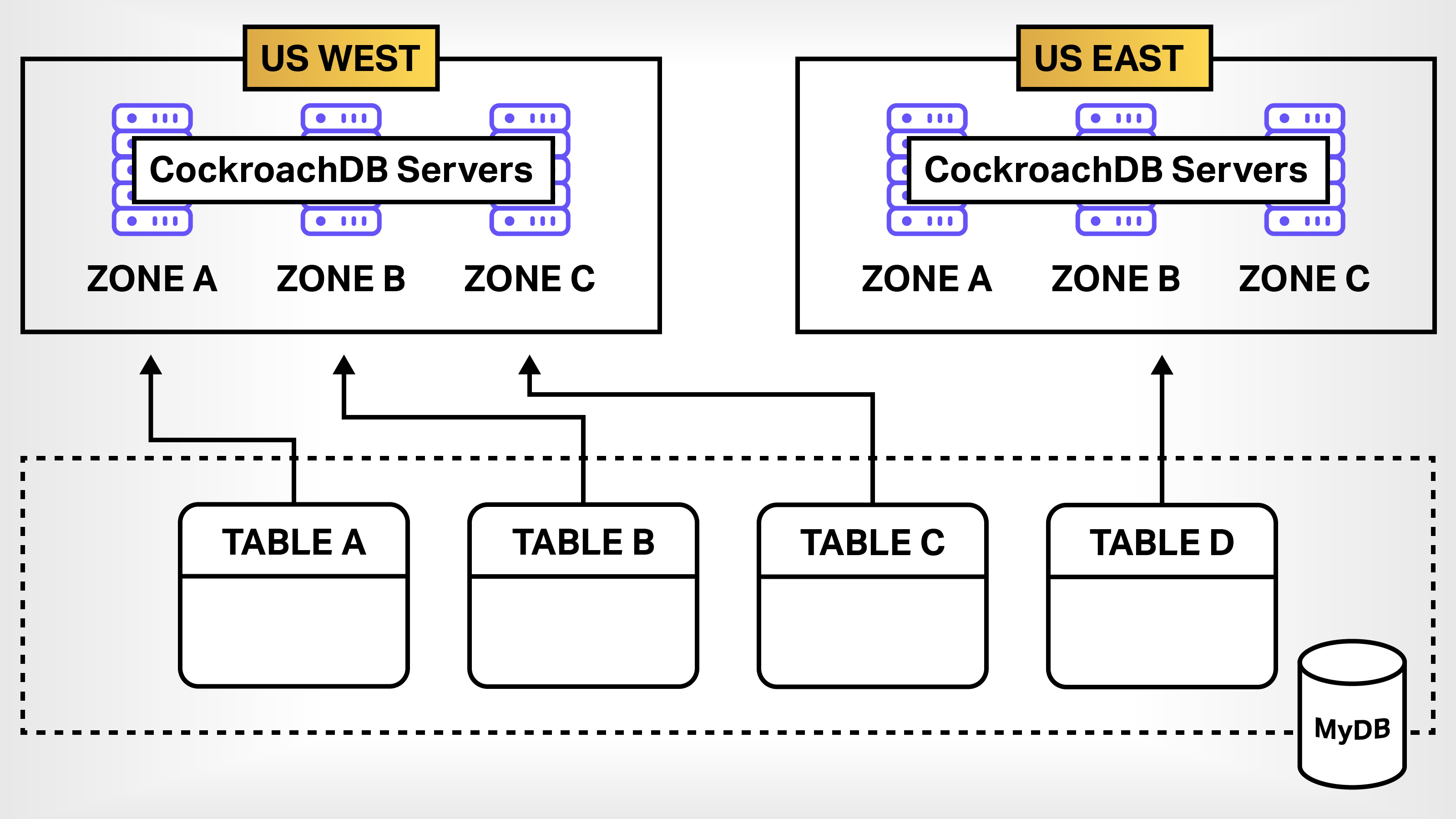 Figure 3 illustrates a CockroachDB database named MyDB that’s bound to database servers in the US EAST and US WEST regions. Notice that three tables in the MyDB database are bound to the US WEST region and one table is bound to the US EAST region. This is an example of using the multiregion feature to segment tables in a CockroachDB to specific geographic locations.