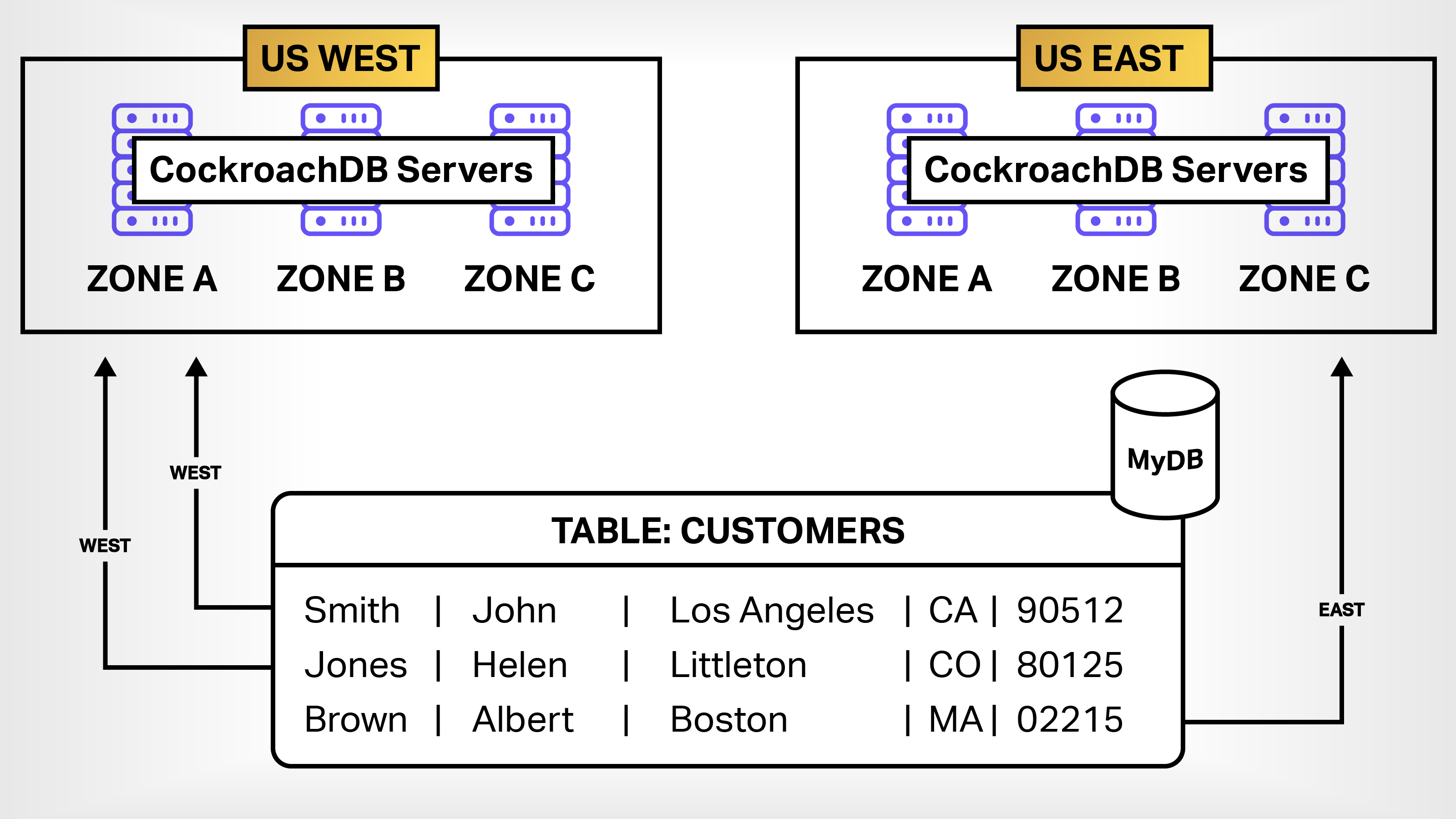 Notice that the first two rows of the table have customers with zip codes that correspond to the Western United States while the last row has a customer with a zip code that corresponds to the East Coast. When CockroachDB’s row-level partitioning feature is enabled, it automatically puts the data for the West Coast customers in the US WEST region and the East Coast customers in the US EAST region. The benefit is that applications running in the West Coast will access West Coast customer data lightning fast.