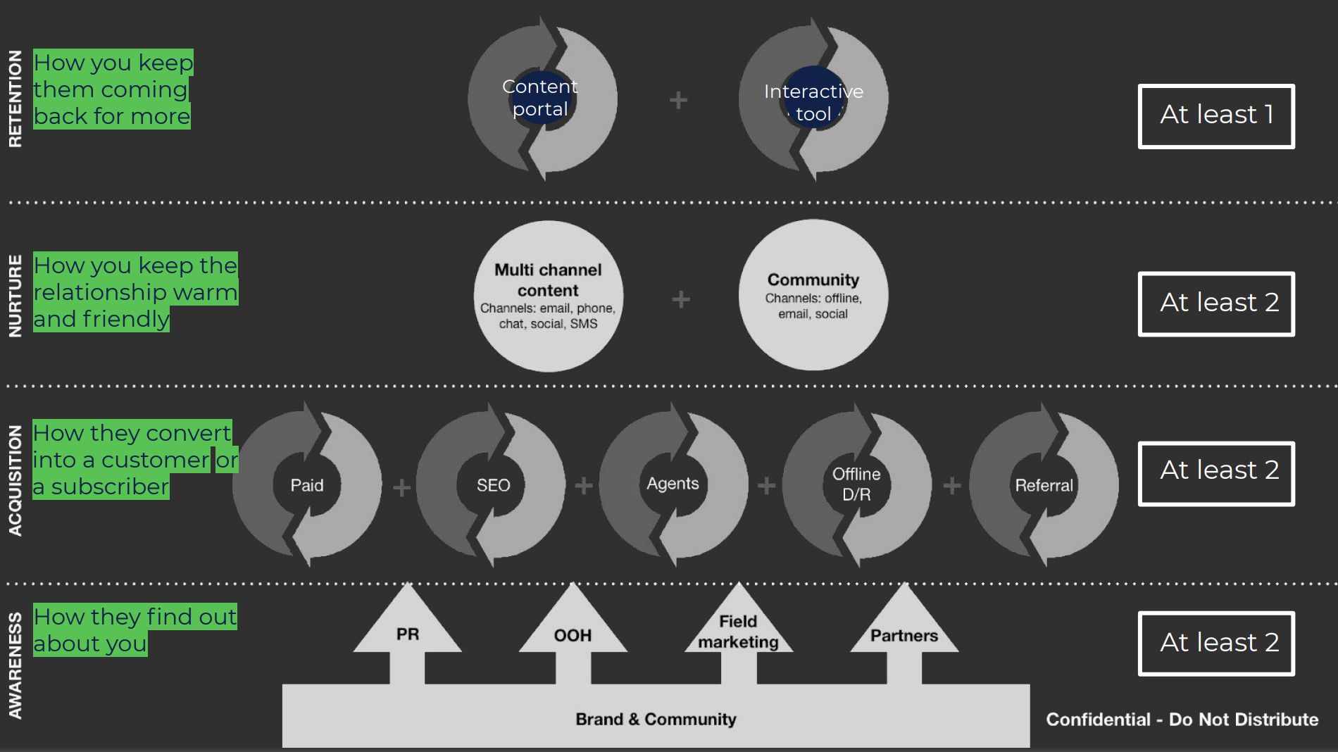 You’ll notice that on the side of this diagram here, I have these kind of recommendation boxes — at least two, at least three, etc. These aren’t hard and fast rules, but it’s more of a guideline to say that you want to aim to have multiple things work. At each layer of your growth model, you don’t want to just be relying on ads or just be relying on SEO, or just be relying on email marketing for your engagement and retention, you really want to have your eggs in multiple baskets. (Timestamp: 07:22)