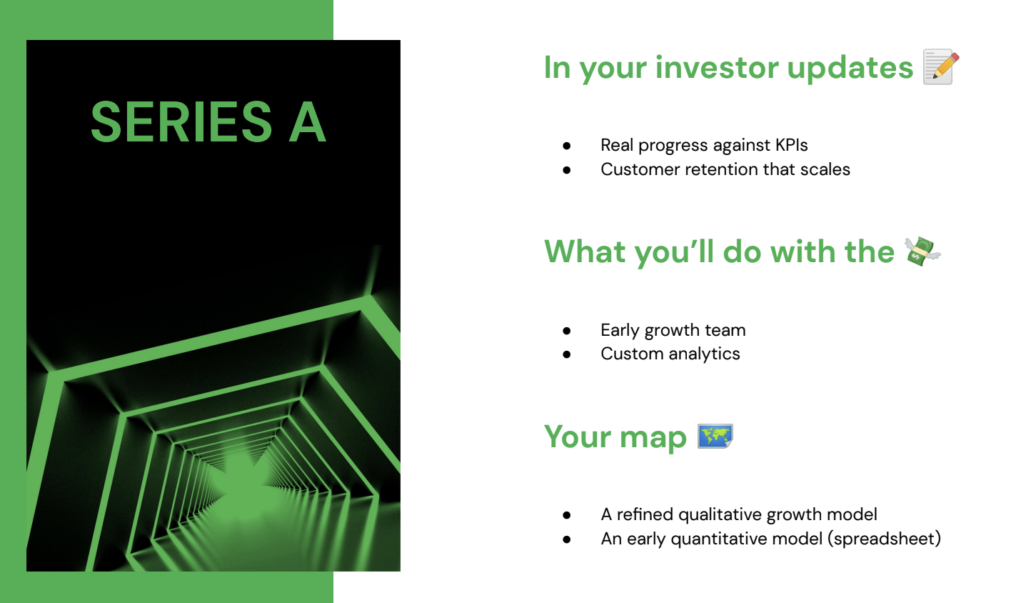 She goes on to discuss how the qualitative model becomes more and more quantitative as you get to later stages. Here’s where you want to be for your Series A raise: