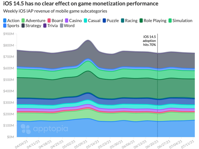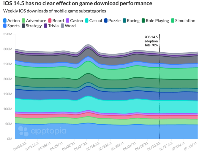 ATT isn’t killing mobile game performance. An Apptopia report found that Apple’s launch of App Tracking Transparency has so far had no clear impact on mobile game download performance or monetization performance. The firm says this could be the result of any number of factors, including publishers using fingerprinting techniques (despite not being permitted), increased ad budgets on large networks like Facebook, increased spend on user acquisition, use of IDFV (vendor identifier) by larger publishers or higher than expected opt-in rates than was predicted.