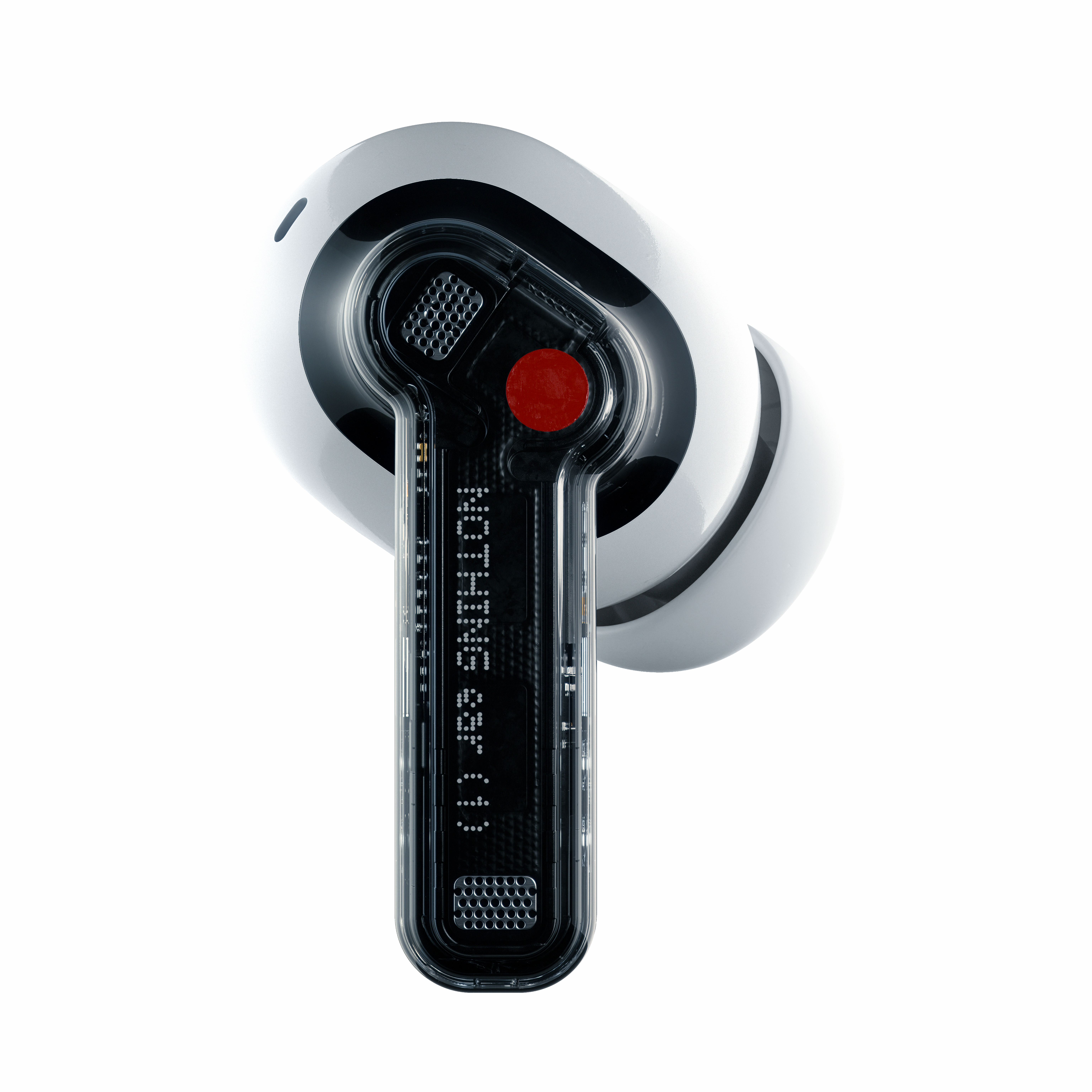 Each stem features a touch panel single color dot — red and white — to distinguish right from left. That’s a subtle nod to RCA cables, with red for right and white for left. Another nice aesthetic touch is the Nothing logo printed down the lengths of the stem. The dotted text is an homage to printing on circuit boards — it’s an aesthetic the company is using across its press material. Around the other side are two magnetic dots that connect to the charging pins in the case.