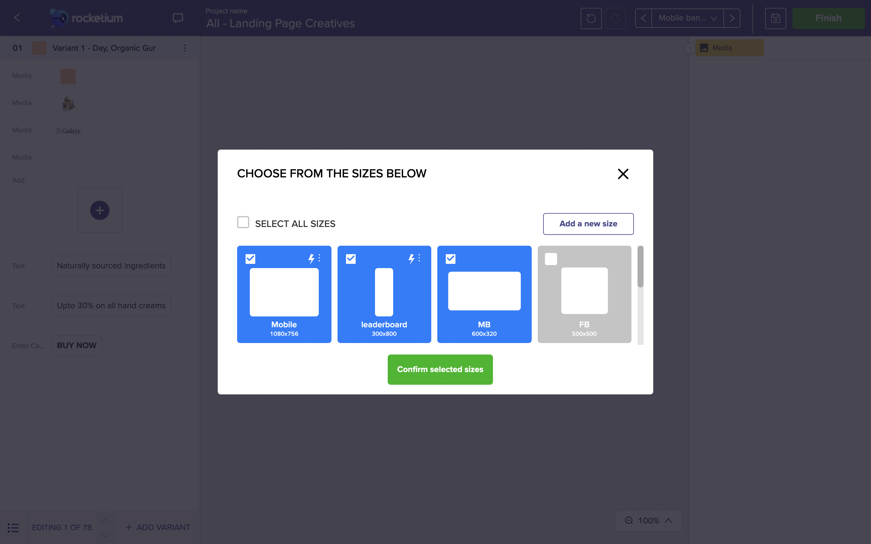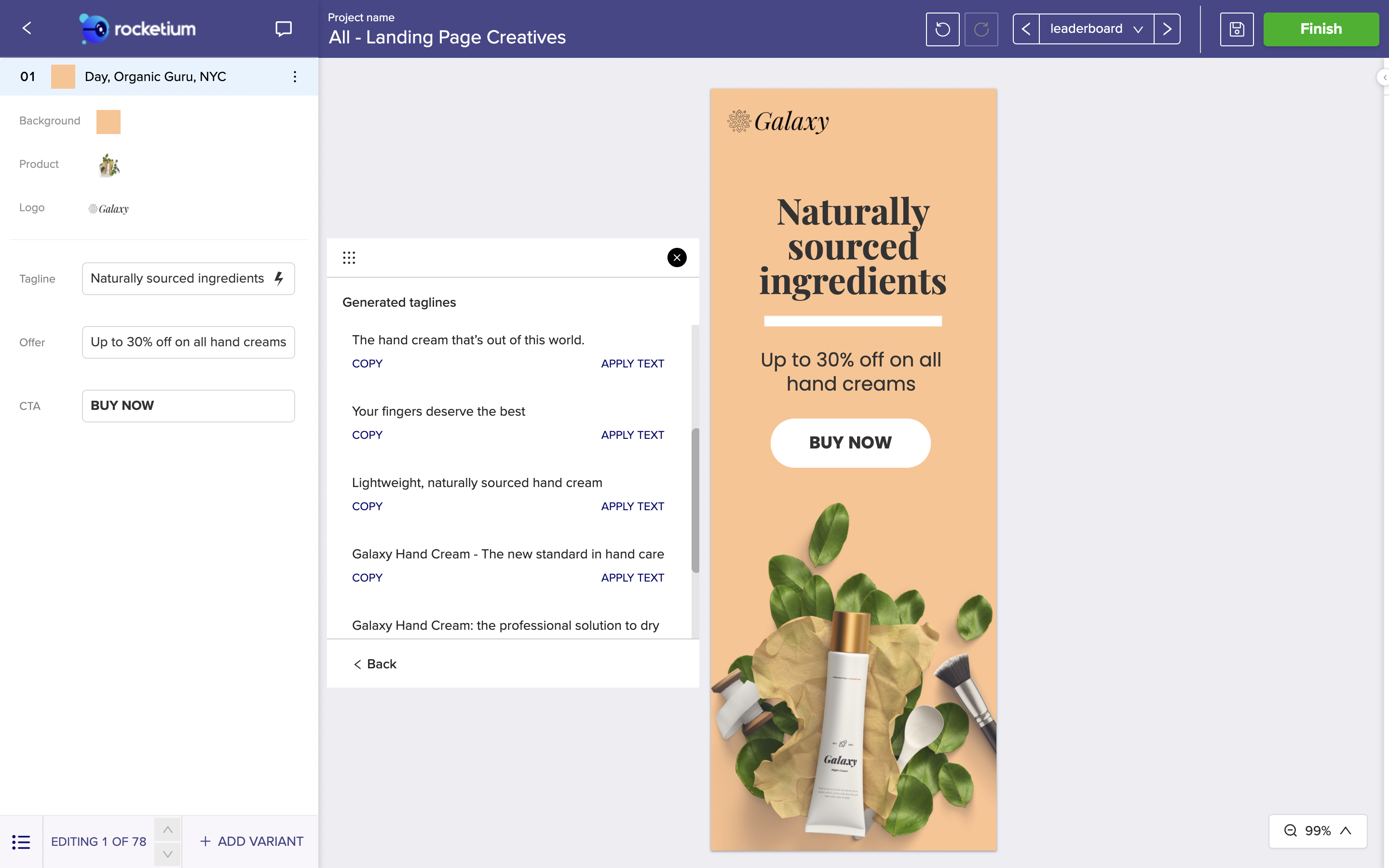 To use Rocketium, design teams create a core set of templates in Photoshop or After Effects and import them to the platform. Then Rocketium customizes ads for different scenarios. For example, if a retailer is running a targeted campaign with free shipping in certain areas, they enter that information into a spreadsheet and Rocketium automatically updates the text in the templates. Then ads and videos are formatted for different platforms, like banners for web advertising or square format for Instagram.