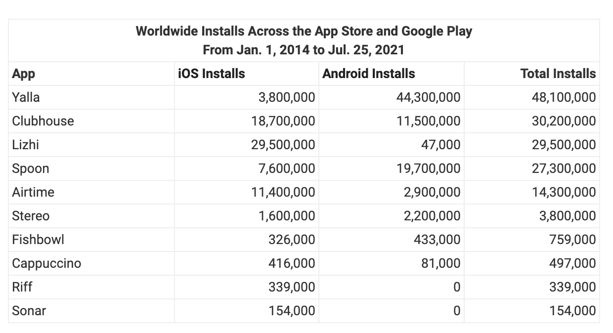There are other newcomers that have managed to stake smaller claims in the social audio space, too, including Fishbowl (759,000 total installs), Cappuccino (497,000 installs), Riff (339,000 installs) and Sonar (154,000 installs).