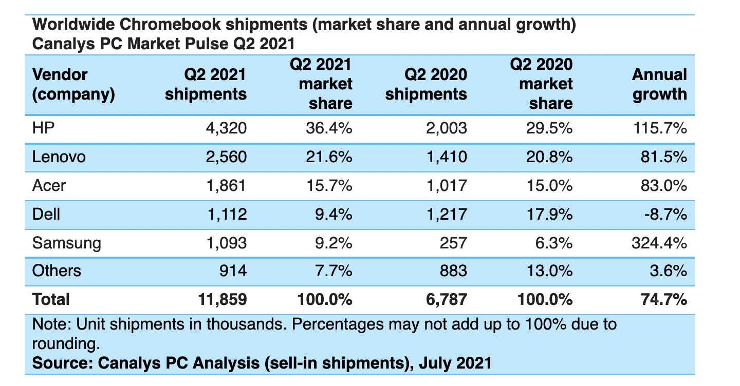 Last quarter, Chromebooks saw 275% year-over-year growth up to 12 million units. The figure isn’t quite as unwieldy for Q2, but a 75% year-over-year growth is still extremely respectable, with the category hitting 11.9 million shipments, per the latest figures from research firm, Canalys.