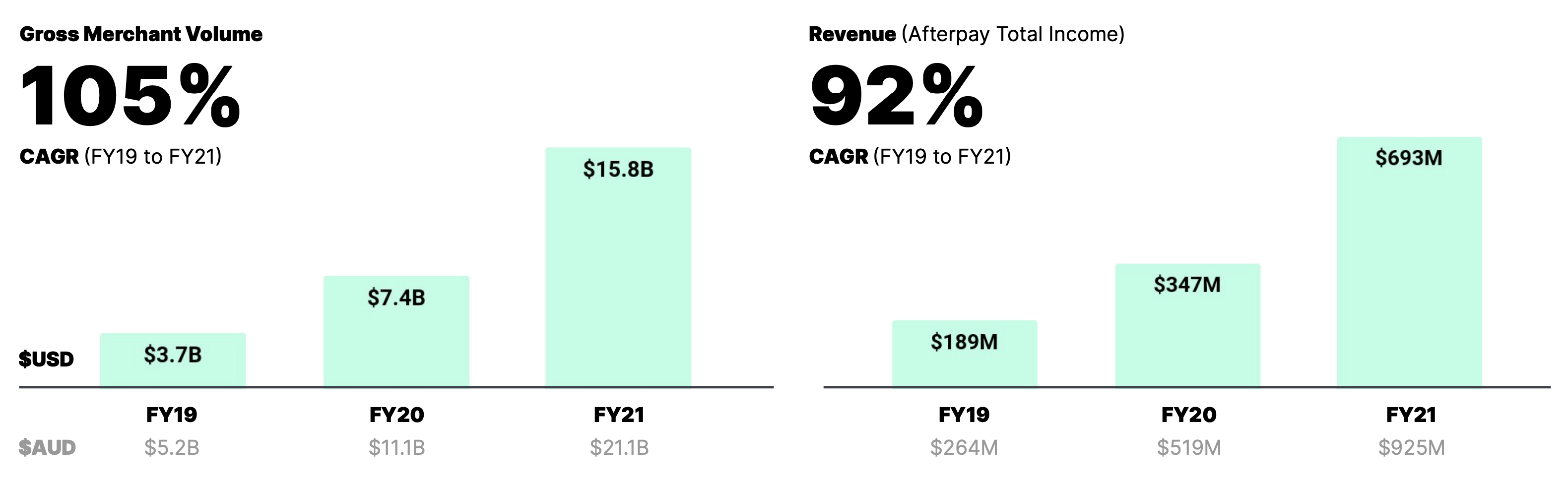 Afterpay, in contrast, is a BNPL player with its own merchant network and customer base. It has also posted very rapid growth in recent years. Per the deck: