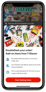 With DoubleDash, after a customer place their original order, a pop-up on the app will entice them with additional items from nearby stores. Customers can also look for the DoubleDash option on the in-app map to search for nearby stores. Depending on the customer’s location and proximity to the merchant, anywhere from one to five merchants will show up on the map. Customers can add on as much or as little as they want for the second order, as there’s no minimum order size.