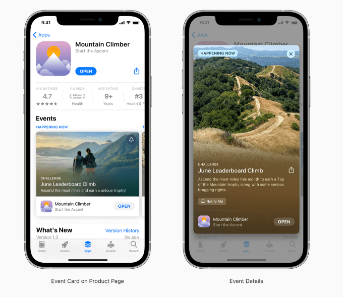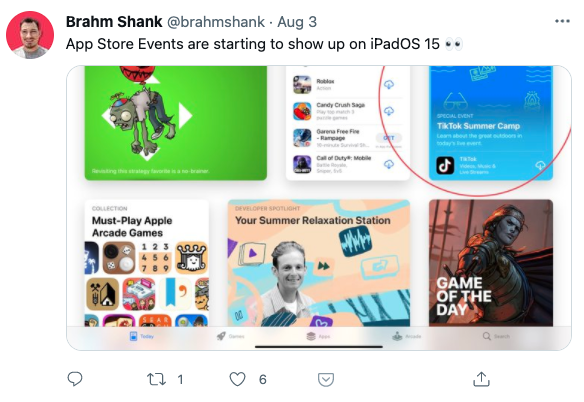The events can appear on the App Store homepage, on the app’s product pages or can be discovered through personalized recommendations and search. In some cases, editors will curate events to feature on the App Store. But developers will also be provided tools to submit their own in-app events. TikTok’s “Summer Camp” for creators was one of the first in-app events to be featured, where it received a top spot on the iPadOS 15 App Store.