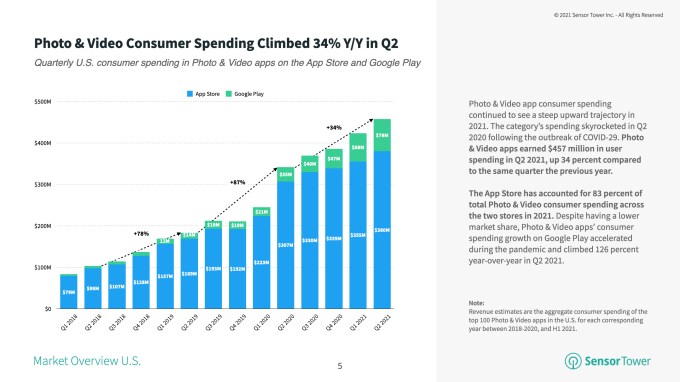 The Photo & Video category on U.S. app stores saw strong growth in the first half of the year, a Sensor Tower report found. Consumer spend among the top 100 apps grew 34% YoY to $457 million in Q2 2021, with the majority of the revenue (83%) taking place on iOS.