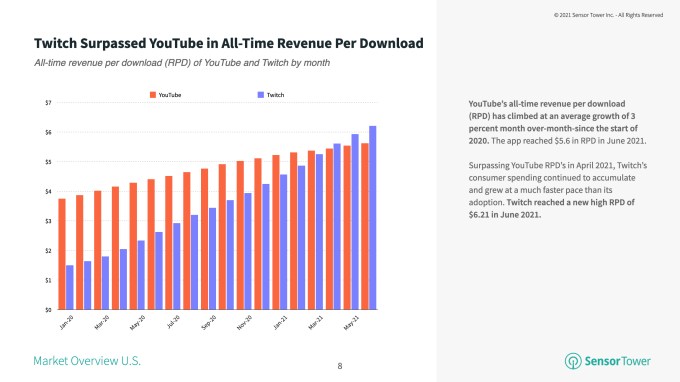 Twitch overtook YouTube in consumer spending per user in April 2021, and now sees $6.20 per download as of June compared with YouTube’s $5.60, Sensor Tower found.