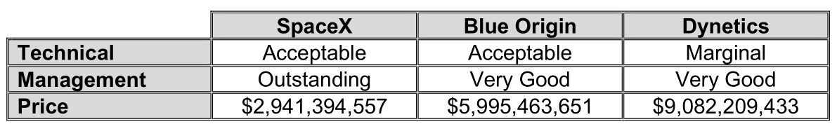 The GAO explains that the decision-making process at NASA weighted the technical approach the highest, then price, then management (i.e. organization, scheduling, etc.). Each company’s proposal was evaluated independently on each of these characteristics, and the final results were compared. Here’s a top-level summary of the ratings assigned: