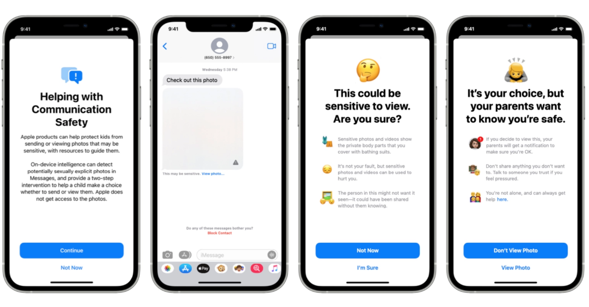 Communication Safety in Messages – A feature that a parent opts to turn on for a minor on their iCloud Family account. It will alert children when an image they are going to view has been detected to be explicit and it tells them that it will also alert the parent.